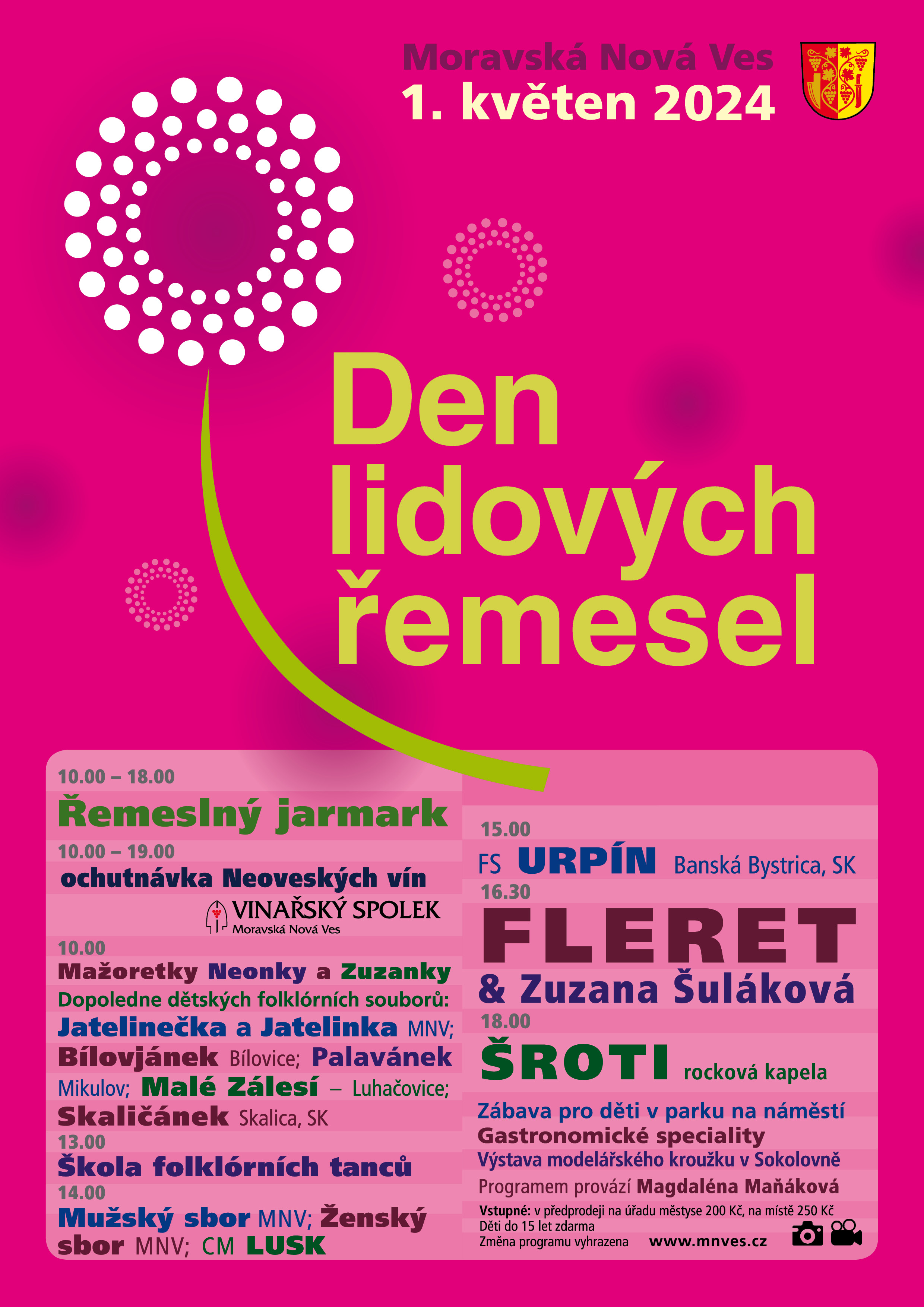 - Městys Moravská Nová Ves Vás zve na tradiční Den lidových řemesel, který se koná ve středu 1. května od 10 h na náměstí. Připraven je celodenní bohatý kulturní program, kdy kromě folklorních souborů vystoupí kapela Fleret a Šroti. Těšit se můžete na řemeslné stánky, dílničky, zábavu pro děti, gastronomické speciality a ochutnávku vína. Na úřadě městyse probíhá předprodej vstupenek na Den lidových řemesel, který se koná 1. května. Cena vstupenky v předprodeji je 200,- Kč, na místě 250,- Kč. Děti do 15 let mají vstup zdarma. Vstupenku můžete zakoupit do úterý 30.4. do 15 h.