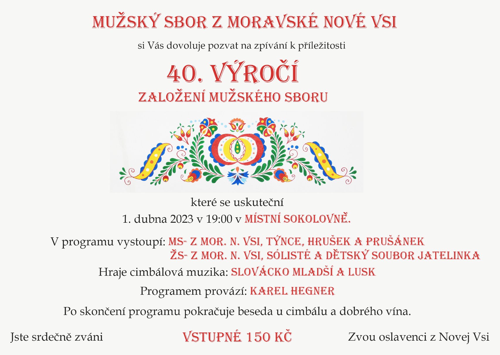- Mužský sbor Moravská Nová Ves Vás zve na oslavu 40. výročí založení, která se koná v sobotu 1.4.2023 od 19 h v místní sokolovně. Vystoupí ženský sbor, mužské sbory a DFS Jatelinka. Hraje CM Slovácko ml., programem provází Karel Hegner.